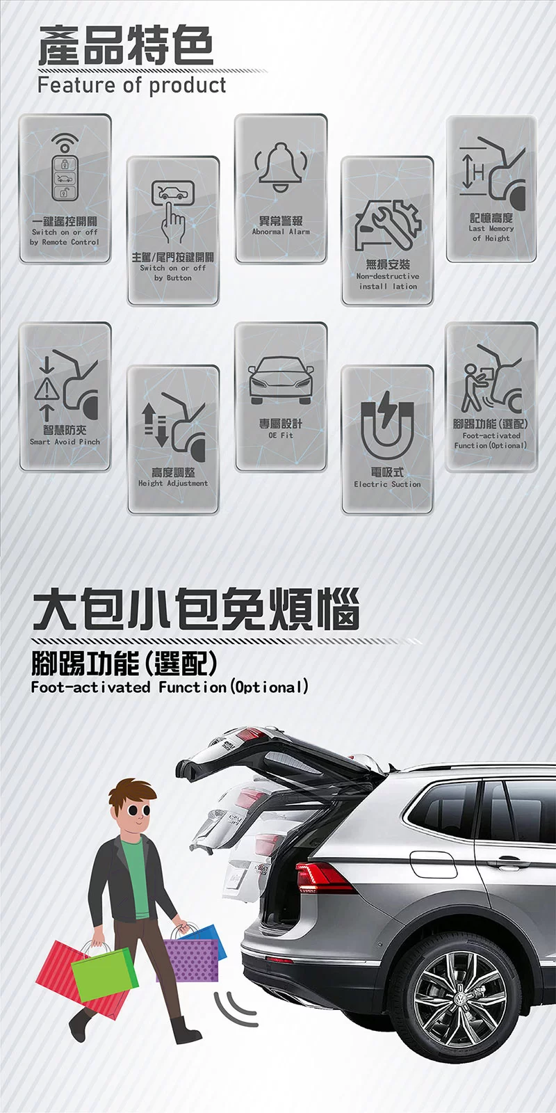 - 支援主駕/尾門按鍵開關